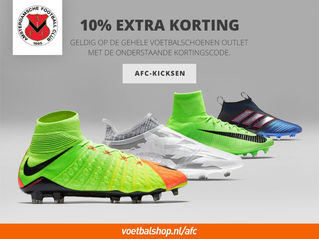 Voor alle leden van AFC is er nu een extra kortingsactie op de gehele voetbalschoenen outlet categorie. Met de onderstaande speciale kortingscode AFC-KICKSEN voor AFC-leden ontvang je 10% extra korting op jouw nieuwe voetbalschoenen.