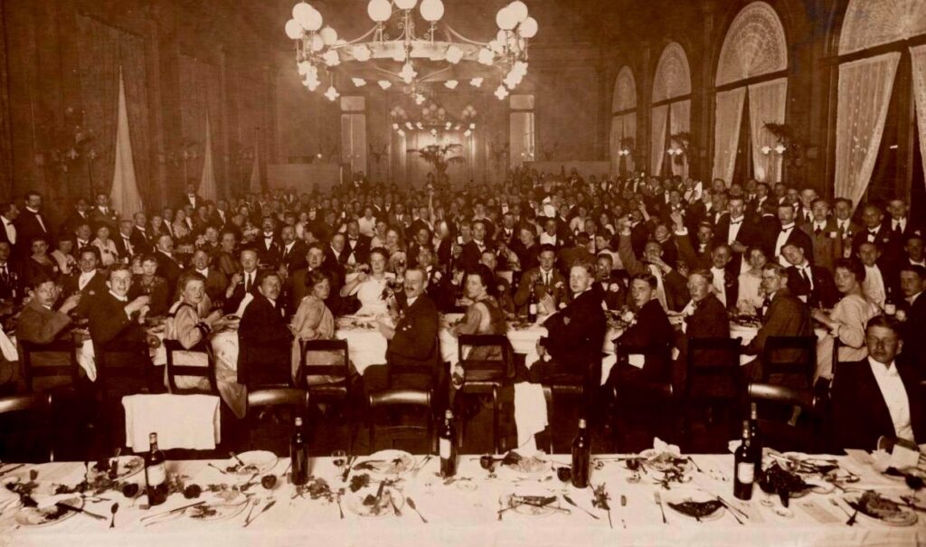 Terug in de tijd naar 1920, 100 jaar geleden. AFC vierde het 25-jarig bestaan met een diner-dansant voor genodigden in het American Hotel in Amsterdam. Alle aanwezige AFC’ers werden tijdens het diner, geflankeerd door hun geliefden, op een foto vastgelegd.