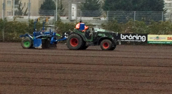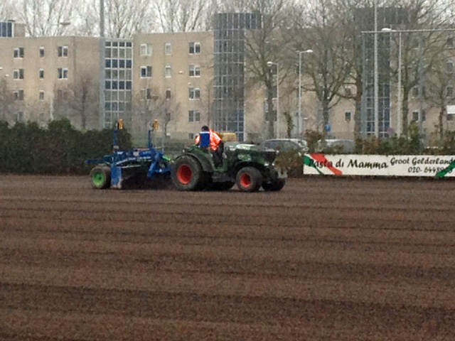 Vandaag wordt het veld geëgaliseerd en opgevuld. Daarbij wordt gebruik gemaakt van laserapparatuur, de gele kastjes achterop de tractor die weer communiceren met een soort van baken op het veld.
