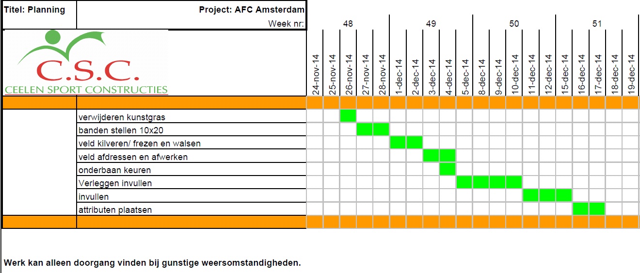 Op woensdag 26 november start het bedrijf C.S.C. in opdracht van de gemeente met de aanleg van een nieuw kunstgrasveld ter vervanging van ons oude kunstgrasveld 3. De werkzaamheden zullen ongeveer drie weken duren. Zie werk timetable hieronder. Om alle trainingen toch doorgang te laten vinden is er een tijdelijk trainingsschema van kracht, klik hier. Het bestuur vraagt uiteraard iedereen om begrip en medewerking.