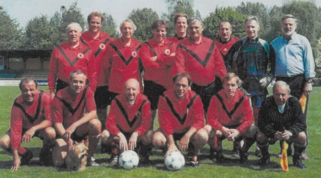Zittend vlnr: Maurice Koster, Ronnie Prins, Hans Coorengel, Ad Westerhof, Joop Nieuwenhuis en scheidsrechter Ab Springer.