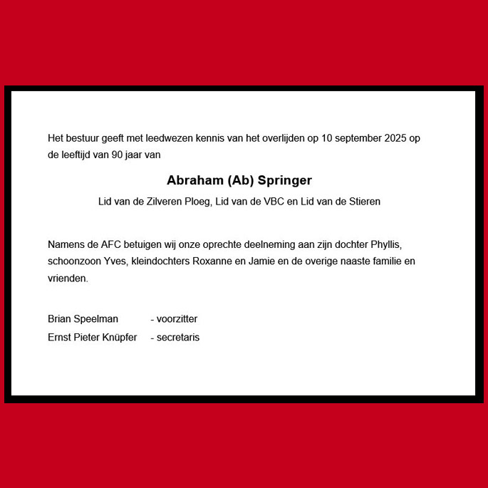 Gisteren bereikte AFC het droevige bericht dat Zilveren Ploeger Ab Springer in de ochtend van 10 september 2025 in de ouderdom van 90 jaar in verzorgingshuis Beth Shalom was overleden.Zo kort na zijn lieve echtgenote Sylvia, die op 1 juni j.l. overleed. AFC brengt langs deze weg Ab’s dochter Phyllis en zijn schoonzoon Yves, hun dochters Roxanne en Jaimy en Ab’s 2 jaar oudere broer, AFC Zilveren Ploeger Jacques, onze welgemeende condoleances over.