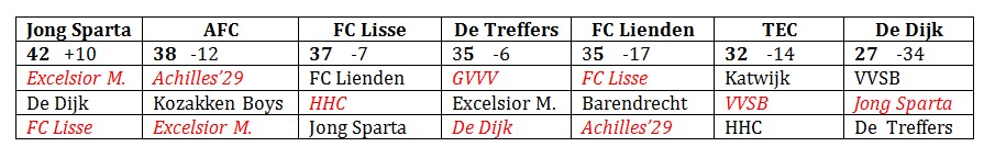 Zaterdag as. gaat de 136 kilometer lange reis weer naar Groesbeek. Eerder dit jaar ontmoetten we in dit voetbalgekke dorp De Treffers. Op 28 januari werd knap met 0-2 gewonnen, mede door een fantastische goal van Tom van den Brink. Drie-en-halve maand later treffen we Achilles’29. Op Sportpark de Heikant wacht ons weer een zeer belangrijke degradatiewedstrijd. Ondanks de zeer goede resultaten na de winterstop zijn we immers nog niet zeker van een langer verblijf in de Tweede Divisie. Directe degradatie is inmiddels wel afgewend, deelname aan de nacompetitie nog niet. Met nog drie wedstrijden te gaan komen nog zes verenigingen en één BVO mogelijk nog in aanmerking voor de tombola, die we nacompetitie noemen: AFC, De Dijk, De Treffers, FC Lienden, FC Lisse, TEC en Jong Sparta. Kijkend naar het programma en het puntenaantal (zie hieronder) kan het nog alle kanten op. Dit met de aantekening dat Jong Sparta vrijwel veilig is en stadgenoot De Dijk nog een klein wonder nodig heeft om niet direct te degraderen.