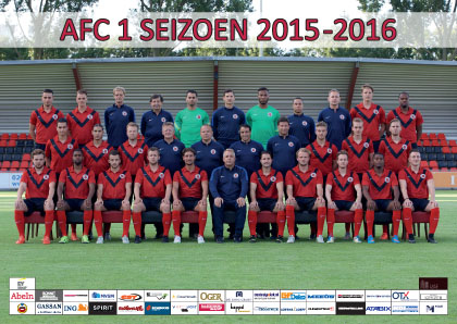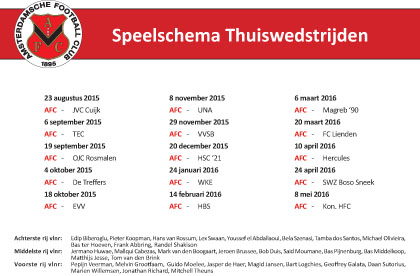 Op de keerzijde de data van de wedstrijden van AFC 1 en haar tegenstanders.