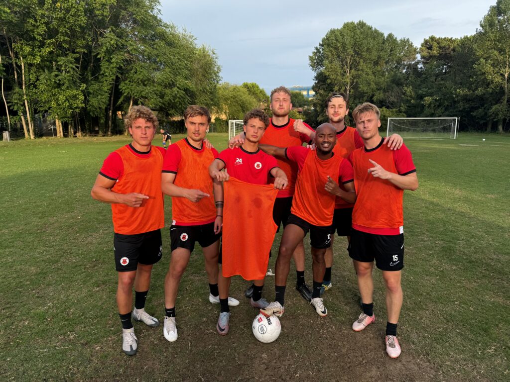 Om 10:00 uur begon de training onder een stralend Italiaans zonnetje. Niet te heet, precies goed. De focus lag op teamtactiek: hoe staan we in het veld, hoe vinden we elkaar sneller, en hoe vertalen we dat naar de wedstrijd. Het tempo zat er goed in, maar de sfeer bleef relaxed.