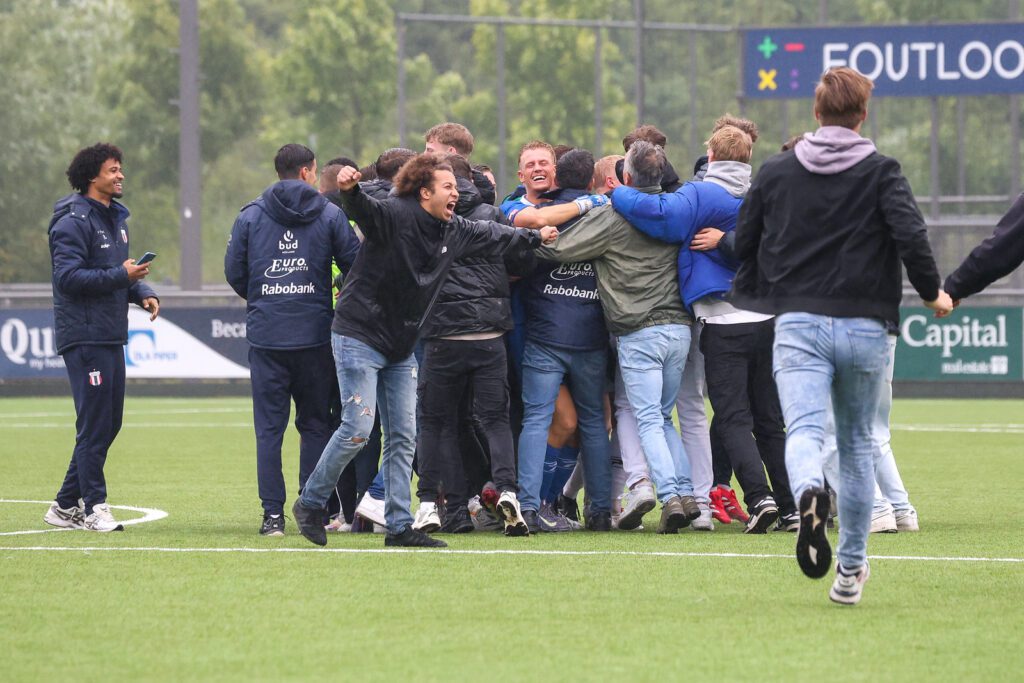 AFC start sterk in de tweede helft. Een prachtig voorzet van Guus wordt door Noa goed geraakt, maar net niet goed genoeg. De bal vliegt langs de verkeerde kant van de paal. Een knal van Milan Eliasar vliegt over de lat en een vrije trap van Julian van der Greft, net buiten het strafschopgebied, smoort in de mêlee voor keeper Van der Kleij. Aan de andere kant vestigt rechtsbuiten Semedo nog maar eens de aandacht op zich met een gevaarlijke actie, die Tim Linthorst maar net weet te stoppen ten koste van een corner. Met nog een half uur te spelen staat het nog steeds gelijk in Amsterdam, maar heeft Noorwijk de 3-1 achterstand in de 54e minuut omgebogen naar een 3-4 voorsprong. Voor Excelsior is het nu alarmfase 1, een doelpunt van AFC kan fataal zijn. In de 65e en 73e minuut wisselt Benno Nihom twee keer twee spelers, collega Claudio Braga wisselt helemaal niet. Voordat hij gewisseld wordt is Melvin Platje heel dicht bij een doelpunt na een fraaie combinatie van Melvin Eliasar en Guus van Weerdenburg, maar de vaak super scherpe spits is dit keer niet trefzeker. AFC is sterker, Excelsior houdt veel spelers achter de bal en loert op een counter. In de 78e minuut is het bijna raak na de zoveelste corner van Julian, maar de uitval via Van der Sande wordt goed door invaller Sven Ederveen verdedigd. Aan de andere kant zijn Guus en Splinter met een oogstrelende combinatie er bijna door, maar vinden keeper Van der Kleij uiteindelijk op hun weg. De spanning is voor Excelsior te snijden en in de 83e minuut schreeuwt alles wat rood-wit-blauw is het uit als Van der Sande twee meter voor open doel de bal over de lat schiet. Een prestatie van jewelste, maar op dat moment beslist niet gewaardeerd door het publiek uit Maassluis. Tot de laatste minuut is het spannend, maar na twee minuten extra tijd is het voor de scheidsrechter uit met de pret en worden de spelers van Excelsior op de schouders genomen door de dankbare supporters. 1-1, net als op 27 mei 2023 heeft de trots van Maassluis het weer gered op sportpark Goed Genoeg. Gefeliciteerd!