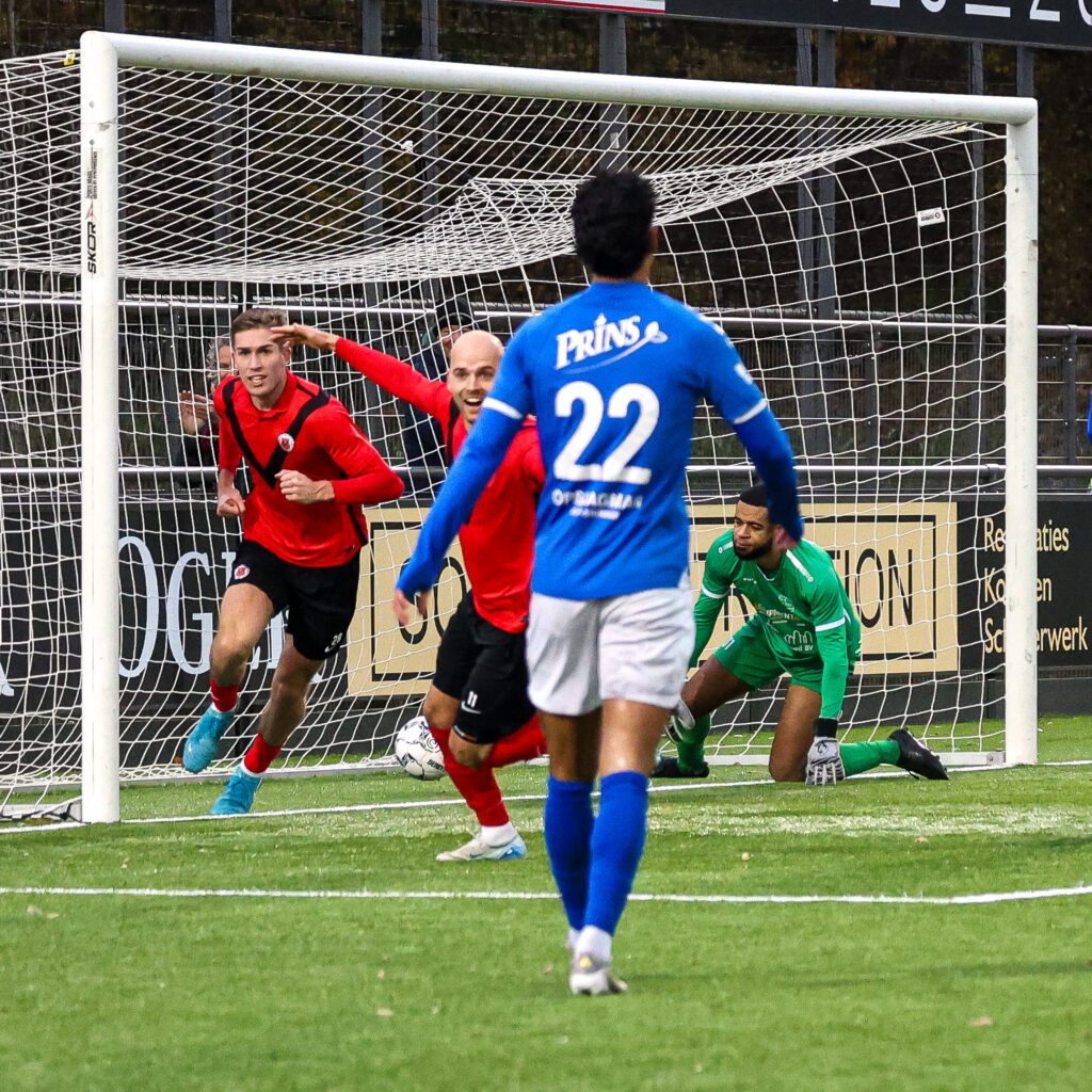 Als de spelers onder leiding van scheidsrechter Eric van der Vaart hun opwachting maken zien we dat AFC en GVVV beginnen met dezelfde basis als een week eerder tegen resp. Jong Almere City en ADO’20. Never change a winning team! AFC dus met Matthijs Jesse en Wessel Been in de spits. Sven Ederveen is opnieuw als rechtsback geposteerd. Cody Claver is gelukkig weer beschikbaar en begint op de bank. Na het eerste fluitsignaal wordt al snel duidelijk dat de supersnelle linksbuiten Genrich Sillé de speler is waar veel om draait bij GVVV. Hij wordt steeds gezocht door zijn teamgenoten, juist ook in de diepte. Sven heeft het er erg druk mee, maar met ondersteuning van Milan Klopper, klaart hij de klus naar behoren. De eerste kans is voor de Veenendalers na een pass van Sillé op centrumspits Ilias Latif, die in het zijnet schiet. Even later doet AFC wat terug na een balonderschepping van Splinter de Mooij. Via Wessel komt de bal vervolgens bij Matthijs die net naast schiet. Het spel gaat op en neer en het publiek komt aan zijn trekken. Een mooie verdedigende actie van Milan Hoek wordt gevolgd door een geweldige knal van de goed spelende Noa Benninga van 23 meter. De bal spat uiteen op de kruising. Ontzettend jammer!