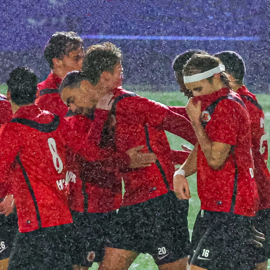 De tweede helft start met ongewijzigde formaties. Het regent nog steeds en je begint steeds meer bewondering te krijgen voor de spelers die er met faire middelen een aantrekkelijke wedstrijd van weten te maken. Net als in de eerste helft begint AFC sterk en in de 49e minuut is het al raak via Noa die een pass van Dalian achter Maats schiet. Helaas gaat de vlag van de assistent omhoog: buitenspel! Na een kwartier wordt er aan beide kanten gewisseld en dat komt vooral het spel van AFC ten goede. De Oranjehemden moeten steeds verder terug en in deze fase is het wachten op de gelijkmaker. Enkele corners leveren niets ook en na een prachtige pass van Milan Hoek, ingevallen voor Noa, weet ook Splinter van dichtbij keeper Maats niet te passeren. Maar in 81e minuut is het toch raak voor The Reds als Oussama Siali, ingevallen voor Melvin Platje, van een meter of dertig zijn linker in stelling brengt. De bal vliegt met grote snelheid in de verre hoek en zelfs Maats is in dit geval kansloos. HHC wankelt en de trots van Salland mag van geluk spreken dat een foutje van Maats niet wordt afgestraft in de 83e minuut door Mitch van Kempen en Splinter. Een prachtige voorzet van Mitch, die uitstekend speelt, wordt door Tim Linthorst vervolgens op een haar na gemist bij de tweede paal. In de 89e minuut kopt Gevero in kansrijke positie helaas over en lijken onze jongens zich tevreden moeten stellen met een gelijk spel. Maar zelfs dat ene puntje lijkt ons niet gegund als invaller Thom Olde Weghuis in de 93e minuut bij een uitval op de paal schiet en uitgerekend Van der Leij klaar staat om de reboud binnen te tikken. Gelukkig blijft ons dat bespaart door een waanzinnige reflex van Gijs die vandaag misschien niet zijn beste wedstrijd keepte maar wel een van zijn allerbeste reddingen verrichtte. Chapeau!
