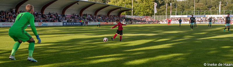 Schuin achter me zit een man in AFC-shirt met zijn gezin. Het staat 1-0 voor de Amsterdamse amateurs. "AFC laat wel kansen liggen," zegt hij grappend. "Nou pap, niet overdrijven, het is wel tegen Ajax hoor," reageert zijn dochter geïrriteerd. Net niet oud genoeg om ironie aan te voelen.