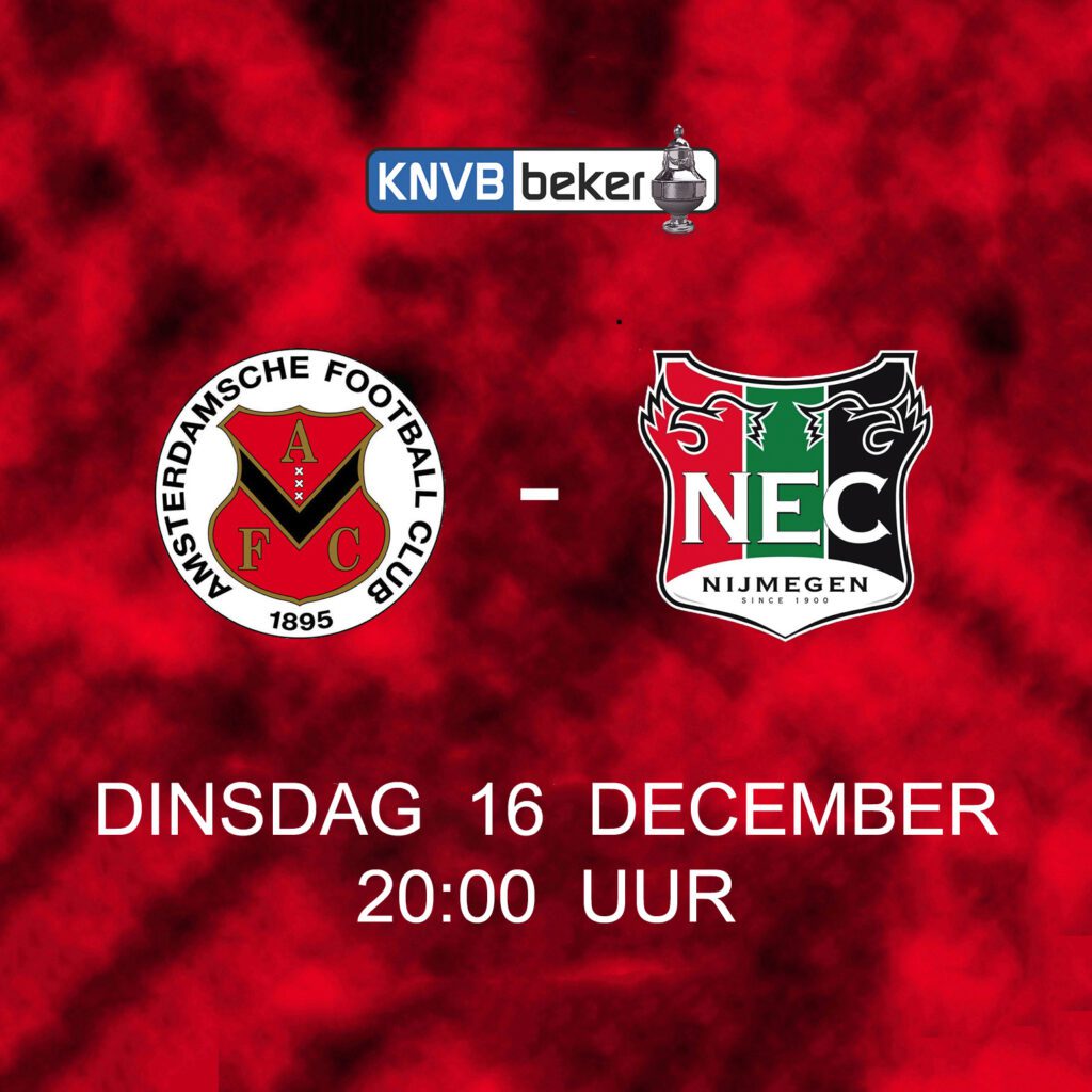 Op dinsdag 16 december 2025 speelt AFC op sportpark Goed Genoeg tegen N.E.C. in de tweede ronde van de Eurojackpot KNVB-Beker. In de eerste ronde won ons aller eerste van Eemdijk met 1-2. In Bunschoten-Spakenburg nam Eemdijk de leiding in de eerste helft, na de pauze werd de ploeg uit de Derde Divisie geveld door een prachtige kopbal van Milan Klopper en een fraaie treffer van Radjenio Fonseca. In deze wedstijd viel Splinter de Mooij uit met een zware knieblessure, een grote domper op de feestvreugde (Zie TV-samenvatting). N.E.C. nam het in eerste ronde op tegen Rijnsburgse Boys. In Rijnsburg leek de eredivisionist op een makkelijke zege af te stevenen na doelpunten van Noé Lebroto, Sami Ouaissa en weer Lebrote. Vlak voor rust scoorden de Uien tegen. Halverwege de tweede helft was het weer raak voor Rijnburgse Boys en was het vervolgens eenrichtingsverkeer richting het Nijmeegse doel. Met veel pijn en moeite trok N.E.C. de 2-3 zege over de streep. (Zie TV-samenvatting).