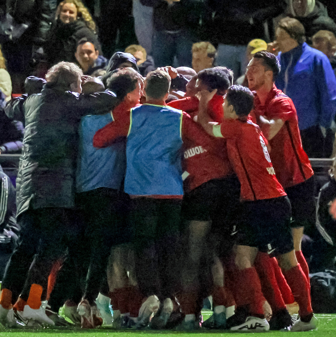 Nog een minuut of wat te gaan en de verlenging dient zich steeds meer aan. Benno Nihom wil nog iets forceren en laat in de 85e minuut Wessel Been, speler van AFC O 21, debuteren. Wessel, die ook nog anderhalf jaar in de jeugd van PEC Zwolle speelde, valt in de 85e minuut in voor Noa, die meer dan zijn best heeft gedaan. Wessel zou eigenlijk niet kunnen spelen, maar zijn tentamen deze avond moet maar even wachten. Goed plan! De bijna 2 meter lange debutant is net op tijd om zich voor het doel op te stellen in verband met een corner die door Raily is afgedwongen. Raily’s schot wordt door de keeper over de achterlijn gestompt. Er zijn 86 minuten gespeeld als Julian van der Greft een perfecte corner aflevert en Wessel de bal onhoudbaar in de touwen kopt, zijn allereerste balcontact ooit in het eerste van AFC. Een beter plot voor een jongensboek is er niet. Alle spelers, bankzitters en staf storten zich op Wessel en AFC viert ook op de tribunes feest. Maar we moeten nog wel een paar minuten en wat extra tijd door met zeer spannende tafrelen in ons strafschopgebied. Apostolos Vellios krijgt nog een mooie kans, maar zijn kopbal is veel te zacht om onze topkeeper te passeren. Als scheidsrechter Rozendal in de 96e minuut voor het laatst fluit is het nu echt feest op Goed Genoeg en worden de spelers met gejuich ontvangen in het clubhuis. Nog nooit won AFC voor de beker van een eredivisieclub, vandaag werd geschiedenis geschreven. Op naar de volgende bekerronde, zaterdag aanstaande weten wij wie we waar gaan ontmoeten.