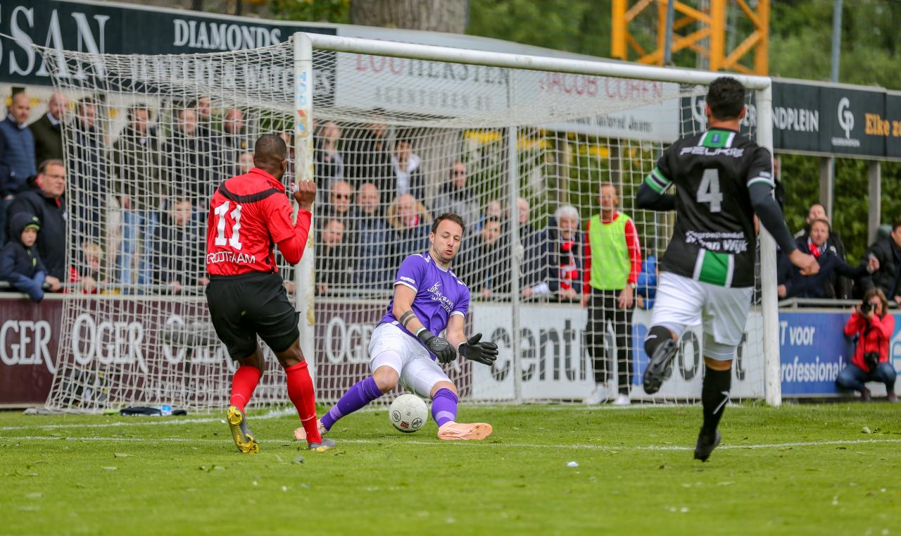 Inmiddels weten we dat IJsselmeervogels in Groesbeek op 4 mei met 3-1 verloren heeft van De Treffers en dat een zege een eind zal maken aan de titelrace. AFC staat in dat geval elf punten voor op Excelsior Maassluis en IJsselmeervogels en dat is met nog drie wedstrijden te gaan meer dan voldoende voor het kampioenschap. Rest nog te winnen van Scheveningen. Makkelijker gezegd dan gedaan, want de druk in zo’n wedstrijd is natuurlijk groot en Scheveningen, dat beschikt over een goed team, heeft zich nog niet helemaal veilig gespeeld. We gaan het allemaal zien, op een zonovergoten Sportpark Goed Genoeg, waar de mensen maar moeilijk een plaatsje kunnen vinden op de volgepakte tribune.