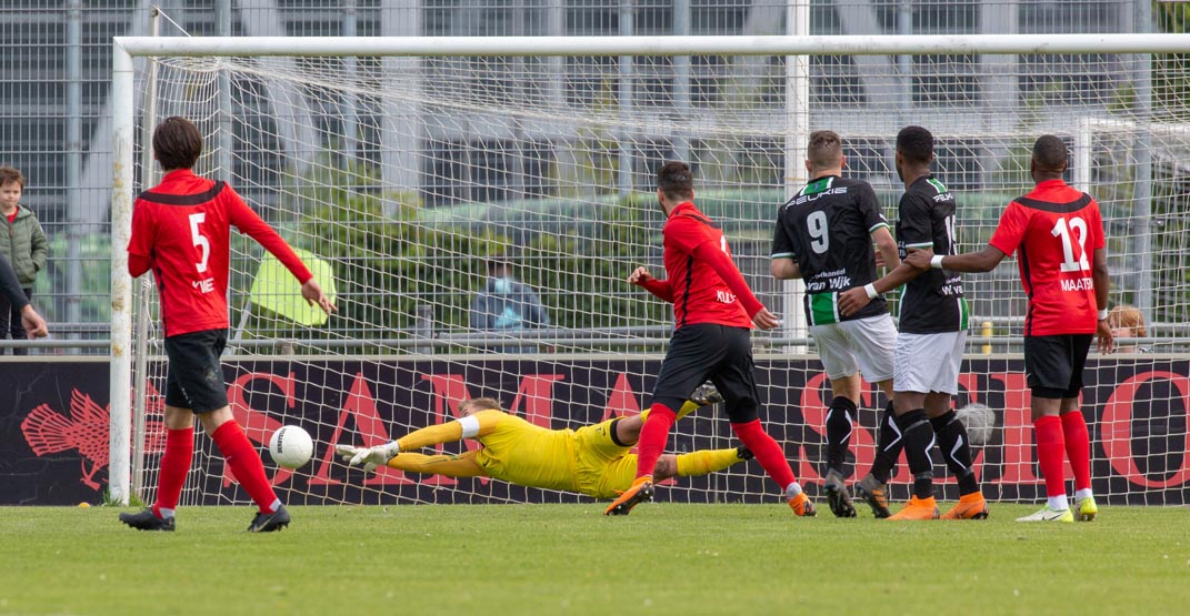 Hoe zal het in de tweede helft gaan? ‘De Schollekoppen’ hebben nog steeds een punt nodig om veilig te zijn en een 1-0 achterstand is natuurlijk niet onoverkomelijk. Onze jongens moeten, zo is het gevoel, nog minstens één keer scoren om de zege en daarmee het kampioenschap veilig te stellen. Hoe gaat een en ander het spelbeeld bepalen? Al snel krijgen we het antwoord als een voorzet van Derre Kwee op de arm komt van Van Ree. De scheidsrechter wijst naar de stip en alles wat een groenzwart shirt aan heeft loopt te hoop bij Wim Bronsvoort. Het helpt natuurlijk niet en Kenny Teijsse mag in de 53e minuut vanaf elf meter aanleggen en schiet de bal feilloos in, zijn 15e doelpunt van dit seizoen.