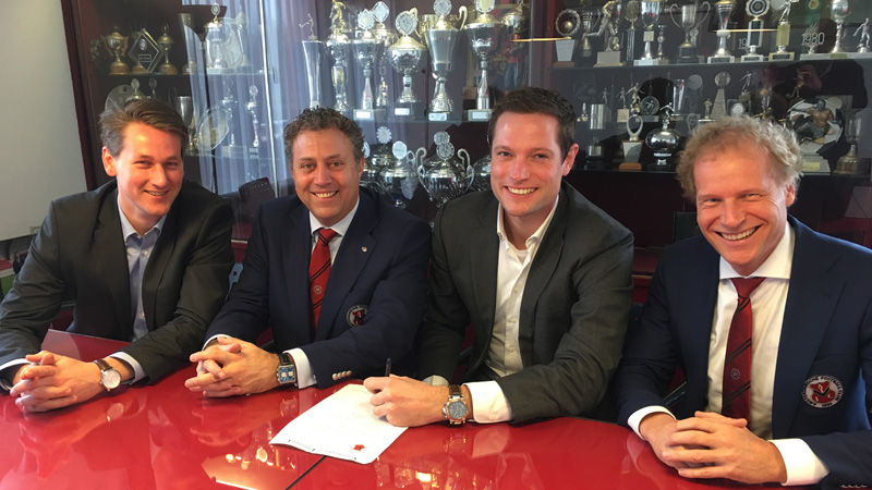Links: Menne Mennes Managing Director Ebury, Ronald Koster, bestuurslid Commerciële Zaken en vice-voorzitter, Peter Post Key account Director en oud eerste elftal speler AFC, Remco Post bestuurslid materiaal en clubhuiszaken.