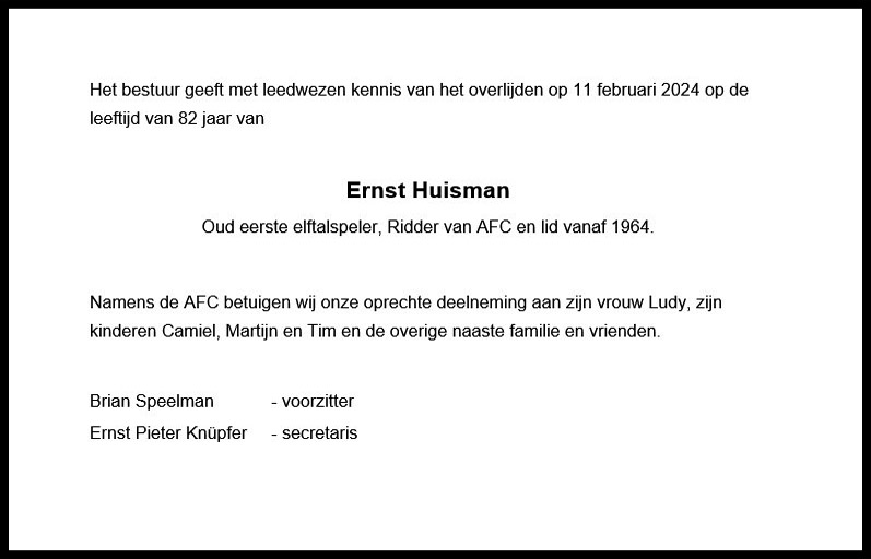 Gedurende zijn bijna 60-jarig lidmaatschap van de AFC heeft Ernst regelmatig laten merken dat hij er trots op was AFC’er te zijn. Ook jongste zoon Tim liet ons weten dat AFC een belangrijke rol in hun vaders leven heeft gespeeld. AFC-Ridder Ernst Huisman zal dan ook zeker in de herinneringen van zijn generatiegenoten blijven voortleven, met respect voor wie hij als AFC’er was, op de velden en daarbuiten.