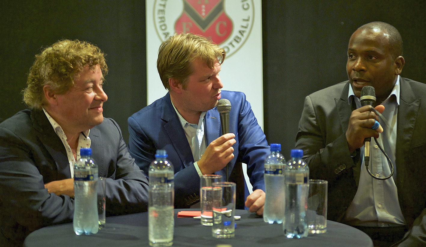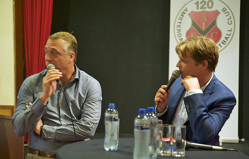Tot slot gaat Mathijs met de uitgenodigde David Endt en Stanley Menzo in gesprek. Als DWV’er heeft hij het in de 70-er jaren vaak moeten opnemen tegen AFC. Het voelde volgens David als een wedstrijd tussen kapitaal en arbeid, een hele ervaring! David heeft er plezierige herinneringen en vriendschappen aan overgehouden en komt nog graag op sportpark Goed Genoeg. Stanley Menzo is er na de winterstop als interim trainer in geslaagd het eerste van AFC in de Topklasse te houden. En topprestatie! Stanley heeft het graag gedaan voor de club waar hij al in de seizoenen 2003-2004 en 2004-2005 trainer was. Hij hoopt in de nabije toekomst weer aan het werk te gaan bij een BVO, maar zal AFC blijven volgen.
