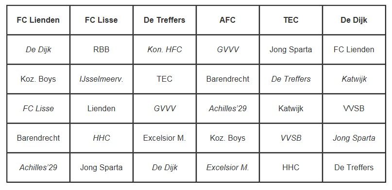 Welke club heeft het zwaarste programma? Er valt eigenlijk geen zinnig woord over te zeggen, anders dat voor De Dijk de nacompetitie het hoogst haalbare lijkt. Verrassende uitslagen zijn er immers in Tweede Divisie aan de lopende band en zullen door de uiteenlopende belangen en de geringe verschillen tussen de teams aan het eind van de competitie nog vaker voorkomen.