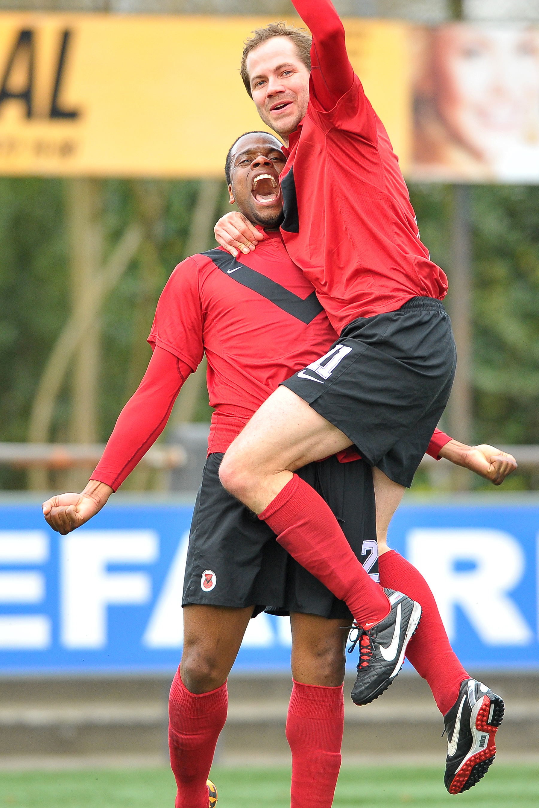 Na rust, zoveel is wel duidelijk, dient AFC uit een ander vaatje te tappen om de groen-witte tien mans formatie van trainer Wilco Klop eronder te krijgen. Er zal, zo zal onze trainer Willem Leushuis ongetwijfeld hebben laten weten, meer strijd geleverd moeten worden en aanvallender moeten worden gespeeld. En zo gebeurt het ook. Het resultaat blijft niet lang uit. Een door Enrico Patrick genomen corner wordt bij de tweede paal gedecideerd door Jasper binnengekopt (1-1) . Met dit doelpunt onderstreept Jasper nog eens zijn waarde voor de ploeg. Hij vervangt de door een blessure afwezige Geoffrey Galata voortreffelijk. Na de gelijkmaker zijn onze jongens er duidelijk nog niet. Weer is het Bas ter Hogt die onze defensie met een handige beweging het nakijken geeft (2-1). En even later is het bijna 3-1, maar Youssef weet knap te redden. Daarmee is de Haaksbergse koek op en toont AFC nog eens aan dat het dit seizoen over veerkracht beschikt. De druk op het doel van keeper Brammer neemt steeds meer toe en uit een zwak verdedigde bal slaat Wout Meulemans, ingevallen voor Daan Sutorius, met een splijtende schuiver in de 64e minuut toe (2-2). Deze goal is, zo blijkt uit de reacties van zijn medespelers, Wouter van harte gegund. De kansen zijn nu echt gekeerd en in de 80e minuut bekroont Laurens Samsom zijn sterke spel met het beslissende doelpunt (2-3). Zijn harde, van richting veranderde schot verdwijnt onhoudbaar onder de lat. In de 89e minuut maakt Randel Shakison het karwei helemaal af op aangeven van Sjoerd Jens, die Enrico Patrick is komen vervangen (2-4).