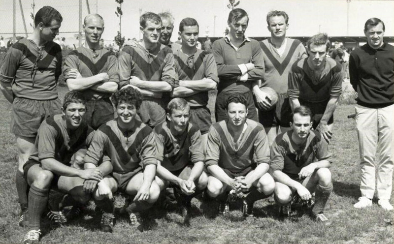 Achterste rij v.l.n.r.: Cees den Braven, Ton van Straaten, Nico van Til, Ton van der Valk (E.C.), Jaap Draisma, Henk Teiwes, Cees Bouwens (met bal), Frans Kat, Rolf Leeser (leider)