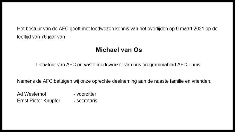 Michael van Os was ook actief betrokken bij de moedervereniging AFC, waar hij jarenlang de interviews verzorgde in het programmaboekje ‘AFC Thuis’. Hij belde mij geregeld op kantoor en vertelde dan welke speler hij zou gaan interviewen en vroeg of ik nog een onderwerp wist voor z’n vragen. Hij had er plezier in en deed het graag. Michael was een trouw bezoeker van het Eerste en was ook bij de uitwedstrijden aanwezig en altijd zeer geïnteresseerd.