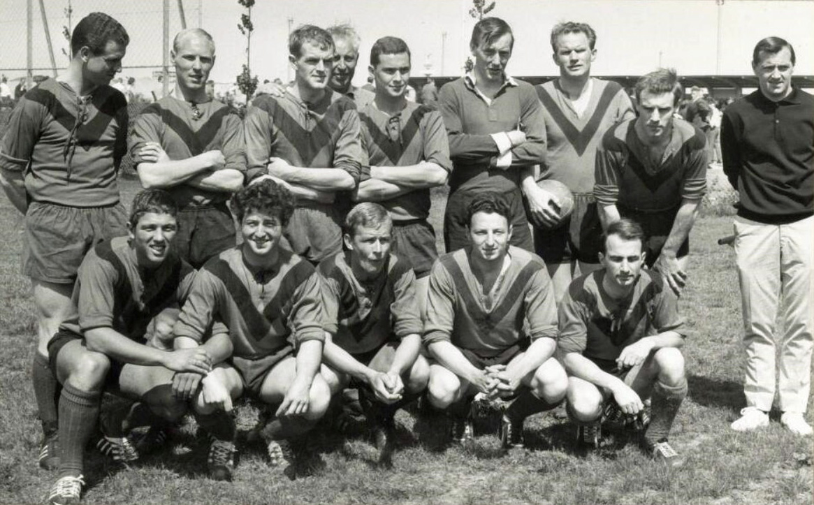 Staand van links naar rechts: Cees den Braven,Tonny van Straaten Nico van Til, Ton van der Valk, Jaap Draisma, Henk Teiwes, Cees Bouwens, Frans Kat en Rolf Leeser