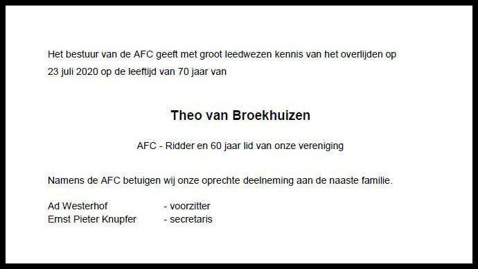 Op 22 juni j.l. overleed na een lang en zwaar ziekbed onze AFC-Ridder Theo van Broekhuizen op de veel te jonge leeftijd van 70 jaar.