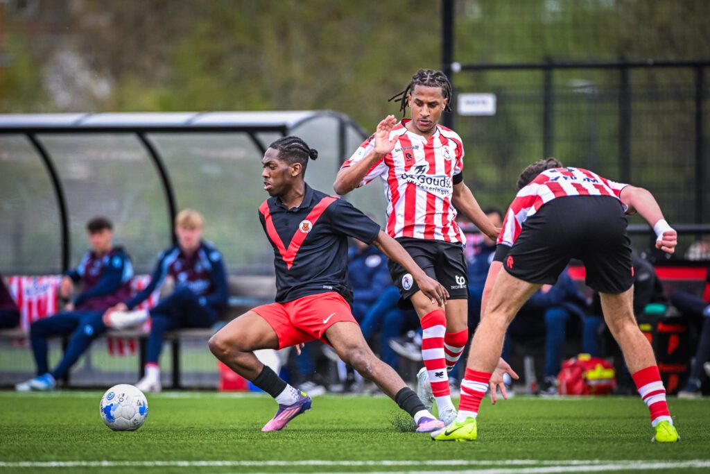 Langzamerhand keert de wedstrijd zich weer een beetje in het voordeel van The Reds en komen Yanic Wildschut, Delano en Radjenio dichter bij het Spartaanse doel. Enkele keren is het ‘net niet’ bij goede mogelijkheden. Zoals een schietkans voor Yanic dichtbij het Sparta-doel en enkele aannames van Delano. Radjenio wordt een keer met veel moeite afgestopt door Max de Ligt ten koste van een corner. Die wordt natuurlijk genomen door Milan Hoek, maar de mooi indraaiende bal wordt goed weggewerkt door keeper Rik Suur. Noach Shenkman, hard werkend op het middenveld, wordt flink aangepakt door zijn tegenstanders, soms veel te hard, zoals door Liam Oetoehganal, die er met geel nog genadig afkomt. Af en toe is Sparta in deze fase ook gevaarlijk en na een half uur mogen we niet klagen als Daniël Hanzen een voorzet van Andy Visser van dichtbij naast schiet. Vooral op rechts laat de opkomende back Justice Esser zich gelden en heeft Indy Lee zijn handen vol aan deze getructe speler. Het is nog steeds 1-0 en AFC probeert vlak voor rust de gelijkmaker te forceren. Helaas stuit een schot van Delano af op een Spartaans been en schiet Ricardo van Rhijn de daaruit volgende corner hoog over. Vlak daarna probeert Ricardo het van afstand nog een keer met jammer genoeg hetzelfde resultaat. Bijna rust, al met al is er met een kleine achterstand nog niet veel aan de hand. Helaas gaat de bal er in de 46e minuut nog wel in. Uit een door Andy Visser goed genomen penalty, nadat Viggo Guit is aangetikt door onze keeper. Heel ongelukkig, dat wel, maar de beslissing van de scheidsrechter valt te billijken. AFC gaat met een 2-0 achterstand de rust in, dat wordt nog een hele kluif om terug te komen.