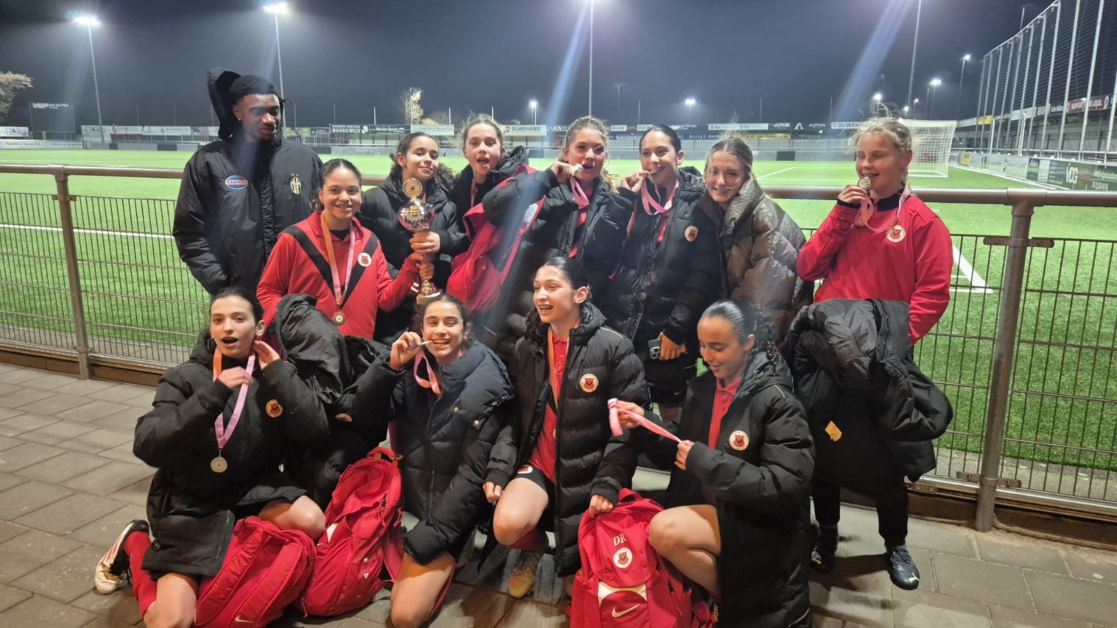 Na het laatste fluitsignaal was er geen houden meer aan. Er werd geschreeuwd, gesprongen en geknuffeld. De beker ging van hand tot hand, de medailles bungelden trots om de nekken. In hun rood-zwarte AFC-tenues straalden de meiden op de groepsfoto alsof ze de Champions League hadden gewonnen. En eerlijk? Voor hen voelde het waarschijnlijk ook zo.