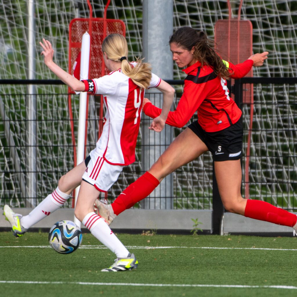 Er was veel publiek en het tempo lag hoog. Leuk om te zien dat heel wat meiden van AFC goed mee konden. Mede dankzij puik keeperswerk van Liv Vonk bleef het lang 0-0.