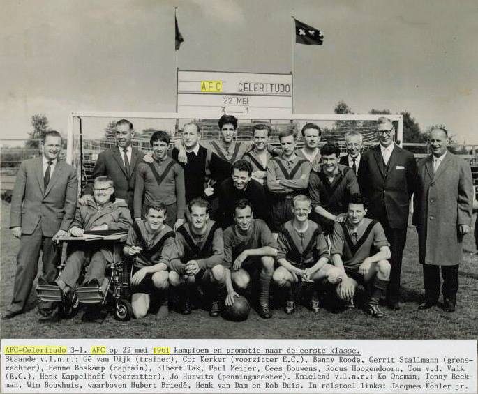Dit verhaal begint op 22 mei 1961. AFC wordt op die dag kampioen na een 3-1 overwinning op Celeritudo en promoveert na 40 jaar (!) van de 2e naar de 1e klasse onder de bezielende leiding van trainer Gé van Dijk en aanvoerder Henne Boskamp. Celeritudo komt nog op 0-1, raakt nog twee keer de paal, maar na doelpunten van Rokus Hoogendoorn, Robbie Duis en Wim Bouwhuis gaan de spelers uiteindelijk op de schouders van de trotse AFC-supporters. Na al die tijd is het gelukt: AFC, ook wel bekend als Amsterdamsche Fuif Club, speelt op het hoogste amateurniveau. En dat wordt uitbundig gevierd met een kampioensreceptie in de de Glazen Zaal van de RAI na afloop van de kampioenswedstrijd. In triomftocht gaan de spelers, hun dames, begeleiders en het Bestuur onder escorte van de bereden politie in drie open calèches, begeleid door de fanfare “Wittenburg”, in een rijtoer door Zuid op weg naar de RAI, waar kampioenschap en promotie tot diep in de nacht worden gevierd.
