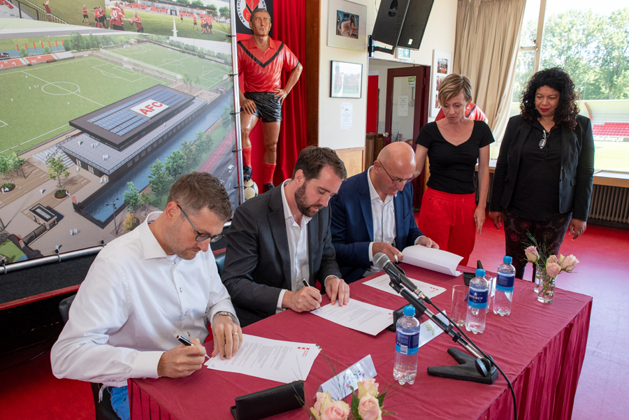 De aanleg van vijf nieuwe kunstgrasvelden en een nieuw clubgebouw voor de Amsterdamsche Football Club (AFC) op het sportpark Goed Genoeg in Zuidas kan beginnen. De gemeente en twee aannemers tekenden op 4 juli 2019 de contracten.
