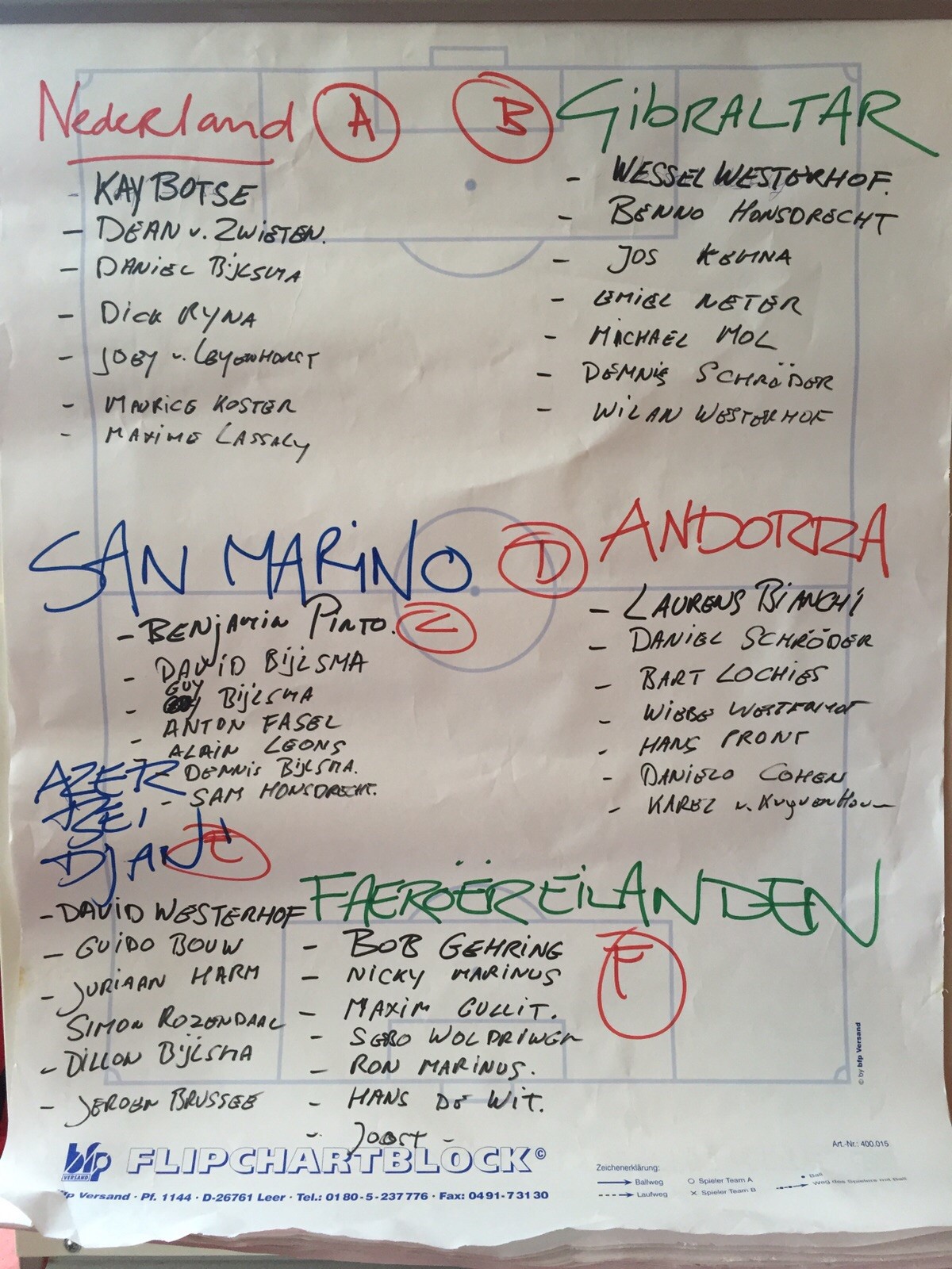 Een mooie opkomst van ruim 60 spelers en supporters zorgen voor een gezellige sfeer en vrolijke begroetingen waarin iedereen elkaar het beste voor 2016 wenste. De loting werd verricht door de organisatie, bestuurslid seniorenvoetbal Lou Hekster, B-commissie secretaris Max Flam en wedstrijdtafel-gastheer Jan Wortel. Zoals altijd stond de loting in het teken van een actueel thema. Dit jaar weer een humorvol idee met een nodige dosis zelfspot; de teams droegen de namen van de landen die zich ook niet hebben geplaatst voor het EK in Frankrijk: Nederland, Gibraltar, San Marino, Andorra, Azerbeidzjan en de Faeröer Eilanden. Een mooie kans voor de spelers om nog een aantal interlands achter hun naam te schrijven.