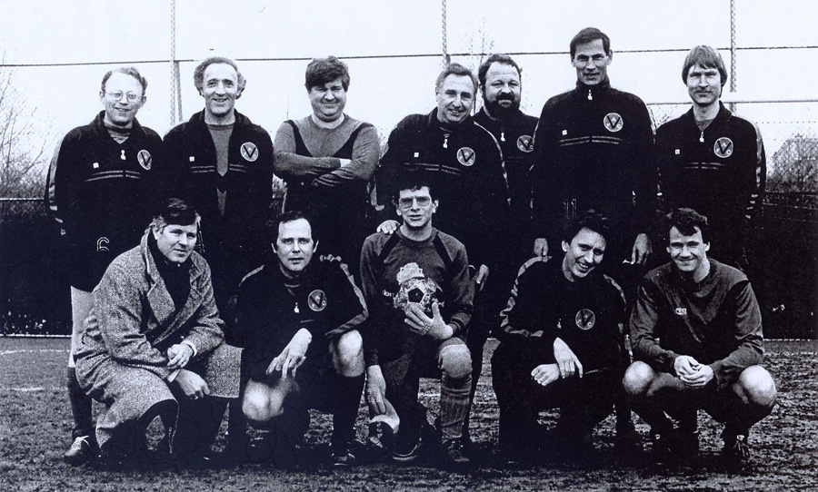 Op de voorgrond Ab de Jong die zijn 65e verjaardag vierde en als rechtsbuiten fungeerde.