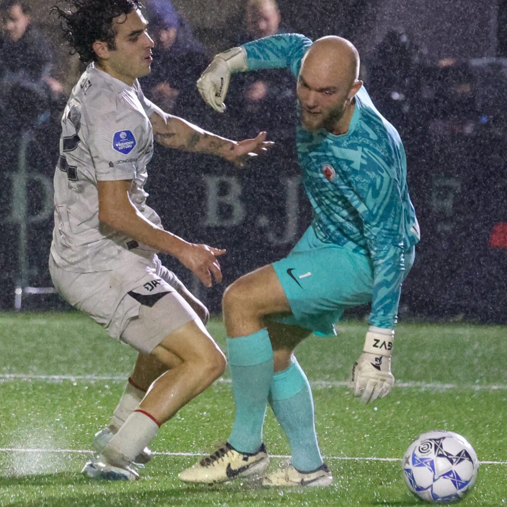 Er is ruim een half uur gespeeld als Victor Jensen de bal oppikt en Milan Hoek op de rand van strafschopgebied, in het hart van de verdediging te snel af is. Het schot van Jensen is niet hard, maar wel zuiver en verrast Gijs van Zetten totaal. 0-1, en daar hadden we op basis van het eerste half uur niet op gerekend. Onze jongens schrikken, willen wat terug doen, maar enkele aanvallen lopen op niets uit. Het spel is op de wagen, gelukkig schiet Min na balverlies van AFC op middenveld hoog over. Niet veel later is het toch 0-2 na een voorzet Finnson, die, bij uitzondering, niet goed wordt verwerkt door Gevero. De terugspringende bal komt voor de voeten van Jensen die zijn tweede goal van de avond maakt. Maar de bitterkoekjes zijn nog niet op. Na een lange, hoge bal belandt ‘het leder’ bij de vrijstaande Min die het scoren over laat aan Migel Rodriguez. 0-3! Het zou ook zo maar 0-4 kunnen zijn geweest als Rodriguez in blessuretijd een prachtige voorzet van de Amerikaan Paxten Aaronson bij de tweede paal iets zorgvuldiger had behandeld. Nu weet Gijs op het nippertje nog te redden.