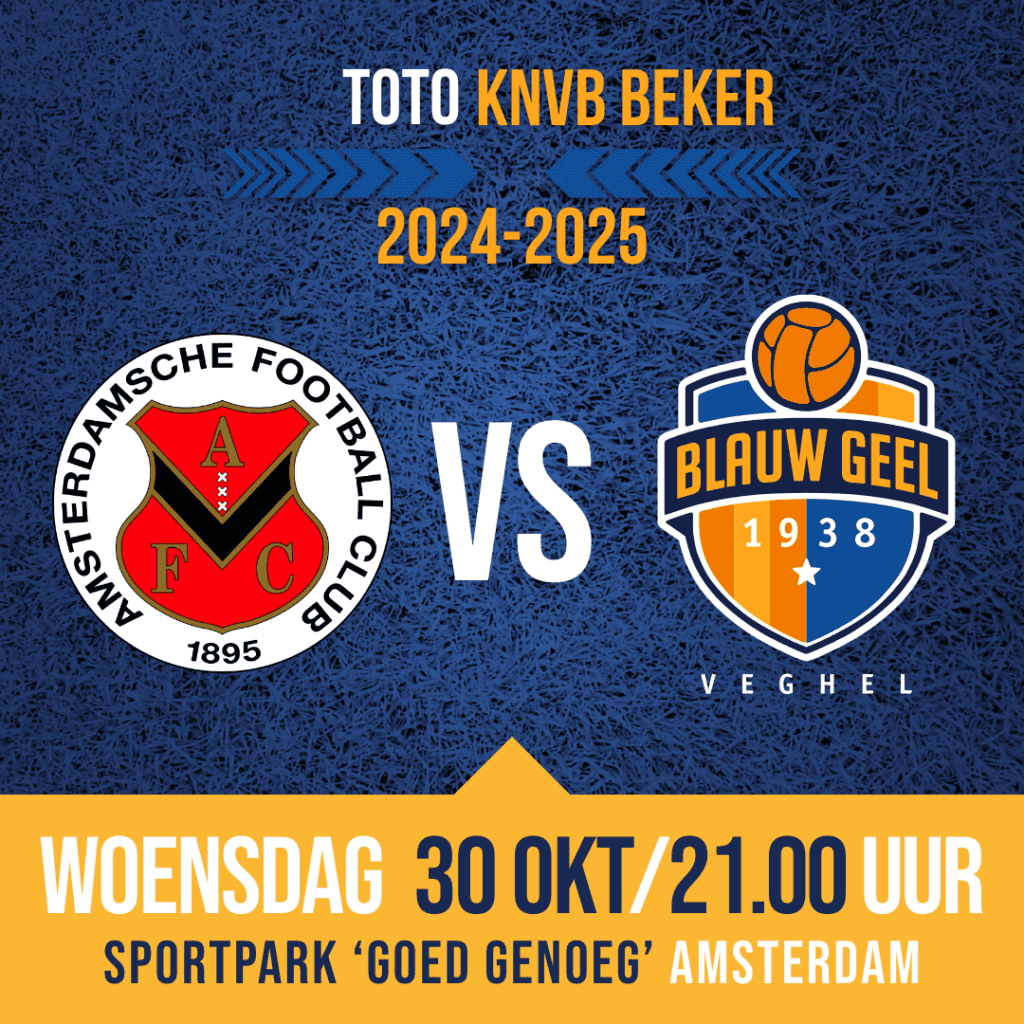 Maar nu eerst het bekerduel tussen AFC en Blauw Geel ’38, twee zondagverenigingen die zich onderscheiden in de Tweede en Derde Divisie. We verwachten een spannende wedstrijd, hopelijk gelardeerd met veel fraaie treffers.