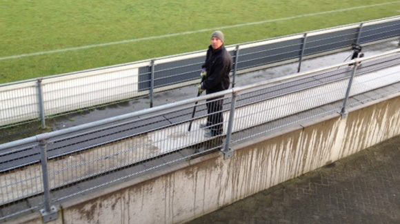 Hassan die bezig is de onoverdekte tribune schoon te spuiten.