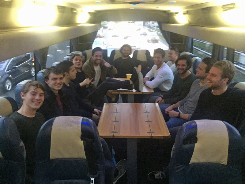 Om 16.20 uur vertrok de luxe bus vanaf Sportpark Goed Genoeg om via de A2 af te zakken naar het Zuiden. Voorin de bus kwamen al snel de kaarten op tafel en werd er wat afgetoept! Achterin de bus waren nog een paar jongens die nog wat werk moesten doen en door de aanwezige tafels was dit geen enkel probleem.